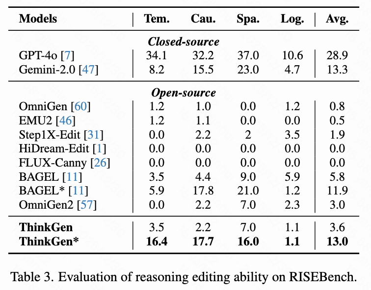 如下表3所示,在 RISEBench 上,ThinkGen 的 CoT 推理能力显著超越了开源模型(3.6 → 13.0),并取得了与闭源模型 Gemini-2.0 相当的结果。