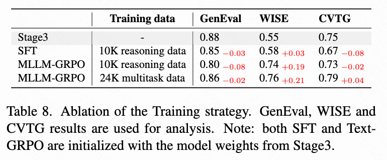阶段1 对齐: 在此阶段,本文引入 K 个可学习的预填充状态,并通过仅训练线性连接器来将 DiT 与 MLLM 对齐,同时保持 MLLM 和 DiT 冻结。阶段2 预训练: 在此阶段,所有 DiT 参数都是可训练的。训练语料库包含 60M 图像样本,包括文本到图像、图像编辑、文本渲染和上下文生成数据。阶段3 高质量微调: 在监督微调阶段,本文构建了一个 0.7M 的高质量子集,以增强 DiT 的指令遵循能力和图像美学。SepGRPO SepGRPO ,一种强化学习训练策略,旨在鼓励 MLLM 生成与 DiT 偏好最佳对齐的标题/编辑指令,同时使 DiT 能够根据这些指令生成更高质量的图像。SepGRPO 解耦了文本和视觉的展开过程:首先,固定 DiT,通过联合多任务训练将 GRPO 应用于 MLLM;然后,固定 MLLM,将 GRPO 应用于 DiT。