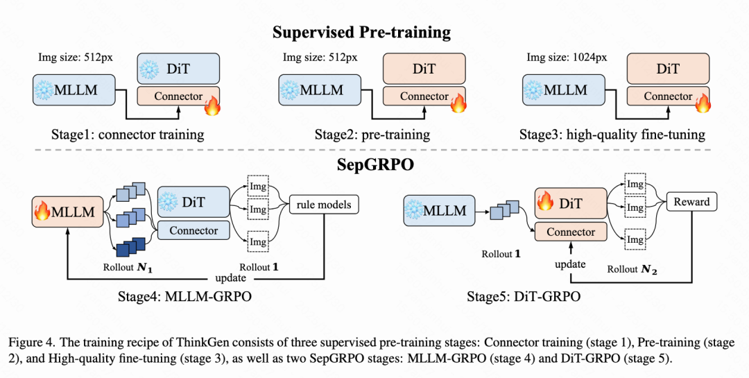 训练策略 ThinkGen 的训练分为五个不同的阶段,如下图4所示。首先,对 DiT 进行监督预训练(阶段 1-3)以确保高质量的图像生成。随后,引入了一种称为 SepGRPO 的可分离 MLLM 和 DiT 强化学习方法(阶段 4-5)。通过 SepGRPO 训练,MLLM 学习生成与 DiT 偏好最佳对齐的描述或编辑指令,而 DiT 则在此基础上进一步优化以生成更优质的图像。