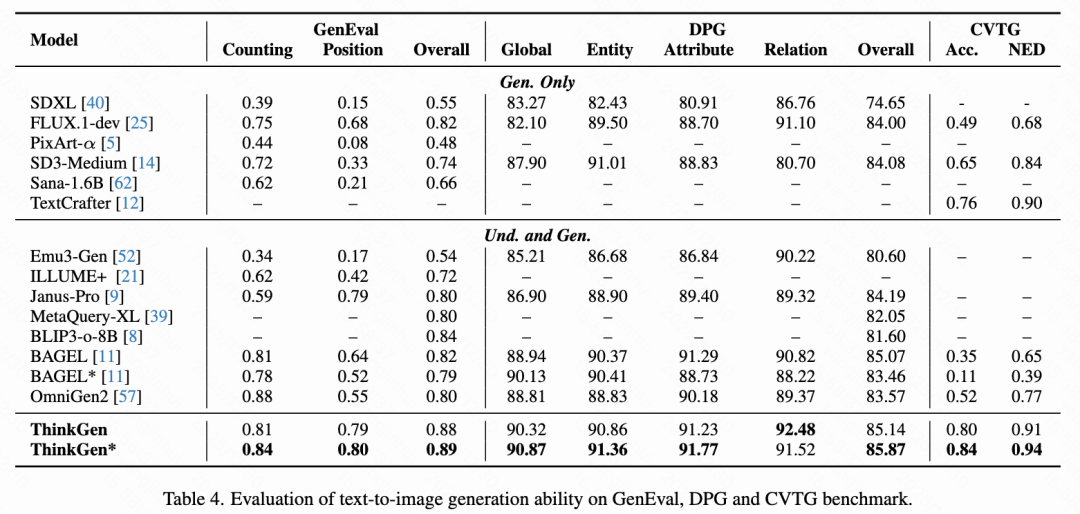 如下表4所示,ThinkGen 在 GenEval、DPG-Bench 和 CVTG 基准测试中,通过 CoT 推理,始终在所有场景中表现出改进,并在许多知名模型中取得了最佳结果。这些结果表明 ThinkGen 具有强大的指令遵循和文本渲染能力。