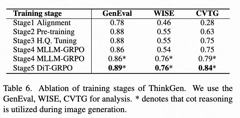 训练阶段消融: 如下表6所示,逐步应用每个训练阶段对 ThinkGen 的性能都有贡献。仅训练连接器(Stage1)导致文本渲染性能不佳(CVTG: 0.28),表明 MLLM 和 DiT 之间缺乏足够的细粒度对齐。 大规模预训练(Stage2)显著改善了图像质量,GenEval 增加了 10%,WISE 增加了 9%,CVTG 增加了 35%。 高质量微调(Stage3)进一步增强了图像细节,CVTG 提高了 +12.0%。 将 GRPO 应用于 MLLM(Stage4)略微影响了 GenEval (-0.01) 和 WISE (-0.01) 上的图像生成,但结合 CoT 显著提升了推理和生成能力(WISE: 0.55 → 0.76)。 DiT-GRPO(Stage5)进一步提高了图像生成质量,尤其是在细粒度文本渲染任务中(CVTG: 0.79 → 0.84)。 Prepadding States: 如下表7所示,预填充状态显著改善了短提示基准测试的性能(GenEval: 0.64→0.78,WISEBench: 0.37→0.46,CVTG: 0.24→0.28,ImgEdit: 3.46→3.93)。训练策略: 如表8所示,直接将 SFT 应用于具有推理数据的 DiT 并未改善推理基准测试的性能。然而,使用 MLLM-GRPO 训练 MLLM 极大地增强了 ThinkGen 的推理能力(WISE: 0.55 → 0.74)。VGI-refine 中的提取策略: 如下表13所示,仅使用 </think> 标记后面的隐藏状态(CUT)比使用所有隐藏状态(ALL)在所有基准测试中都产生了持续的改进,尤其是在短提示生成任务中。这表明截断 pre-</think> 隐藏状态可以有效消除冗余信息,从而提高图像生成质量。