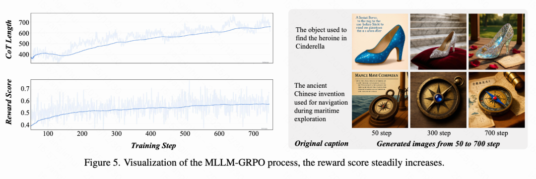 CoT 长度增加: 平均 CoT 长度逐渐增长,表明模型在训练期间发展出更复杂的推理能力。统一奖励增长: 随着训练的进行,多任务奖励稳步增加,表明 ThinkGen 学习在不同场景中自适应地思考。图像质量改进: 50、300 和 700 步的图像可视化显示出图像生成质量的明显提升趋势,生成的图像展现出更丰富的细节和更高的保真度。结论 ThinkGen ,一个新颖的思考驱动框架,能够自动地将思维链(CoT)推理应用于多样化的生成任务。本文的方法采用解耦的 MLLM-DiT 架构,并通过 SepGRPO 进行训练,使其能够在生成之前制定高质量的计划。广泛的实验证明,ThinkGen 在推理密集型任务上取得了显著的改进。本工作代表着构建更智能、更通用、无缝整合推理与创造的生成模型迈出了关键一步。