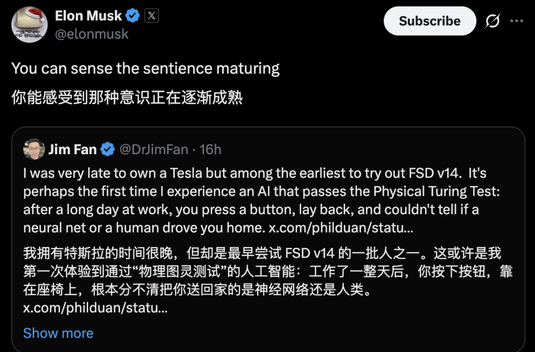 虽然通用的家庭服务机器人尚处于实验室阶段,但Jim Fan认为,Tesla FSD v14在自动驾驶这一特定垂直领域,已经率先通过了物理图灵测试。