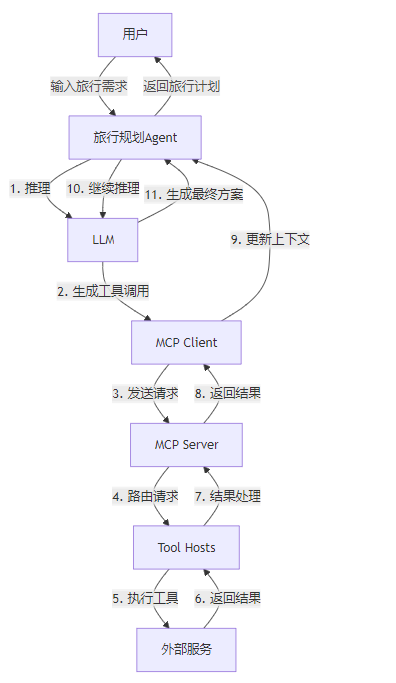 我们构建了一个基于ReAct架构和MCP的智能旅行规划Agent,该Agent能够根据用户需求,自动规划旅行行程,包括查询天气、预订机票、查找酒店等。