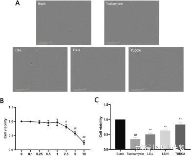 湖南中医药大学的科研人员在该文章中使用了AbMole的2款试剂:Tauroursodeoxycholic acid (TUDCA,牛磺熊去氧胆酸,AbMole,M5158)和CCK-8(Cell Counting Kit-8,AbMole,M4839),该研究旨在探讨枸杞和丹参的组合(Lycium barbarum L. and Salvia miltiorrhiza Bunge,LS)对视网膜色素上皮(RPE)细胞凋亡的保护作用及其对内质网(ER)应激的调节。研究人员使用衣霉素(Tunicamycin)诱导ARPE-19细胞内质网应激,随后用LS处理24小时,并通过CCK-8法评估细胞活力,Annexin V-FITC/PI染色和TUNEL法检测细胞凋亡,Western blot和RT-qPCR检测相关蛋白和基因表达。结果显示,LS处理后ARPE-19细胞数量增加且排列整齐,LS高剂量组(1mg/ml),可提高细胞活力,显著抑制ARPE-19细胞凋亡,并降低内质网应激相关因子的表达水平。研究表明,LS通过抑制内质网应激减轻ARPE-19细胞凋亡,对视网膜具有一定的保护作用。TUDCA作为内质网应激抑制剂,在实验中作为阳性对照。其主要作用是通过改善内质网折叠能力,减轻内质网应激,从而抑制衣霉素诱导的ARPE-19细胞凋亡。研究中使用100μM TUDCA处理细胞24小时,结果显示其能显著提高细胞活力,降低细胞凋亡率,与LS的作用效果相似。