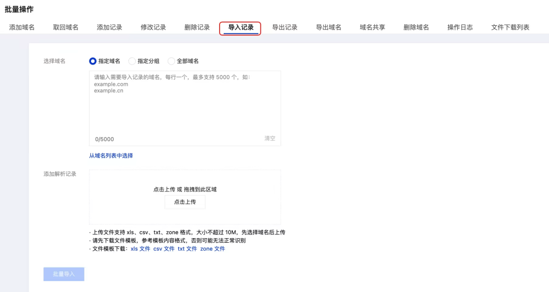 2) 精准导入新系统:在腾讯云解析DNS控制台的【我的解析】中添加域名,并通过【批量操作】->【导入记录】功能完成数据迁移。