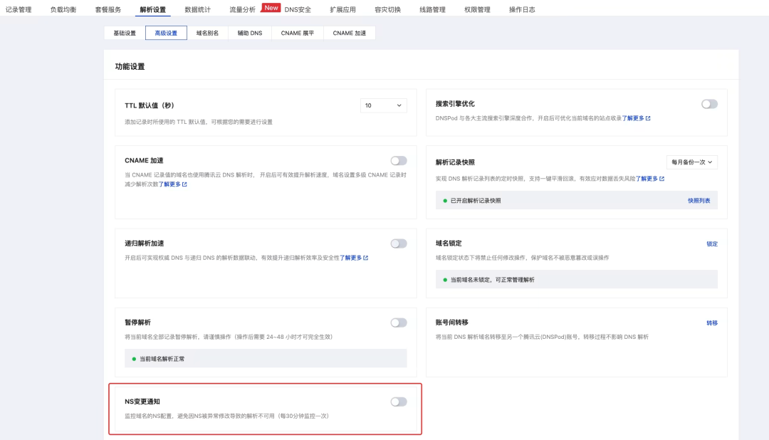 5 )启用安全监控:在腾讯云解析DNS控制台为域名开启“NS变更通知”功能。此后任何对该域名NS记录的修改,您都将通过短信、邮件或站内信及时知晓。