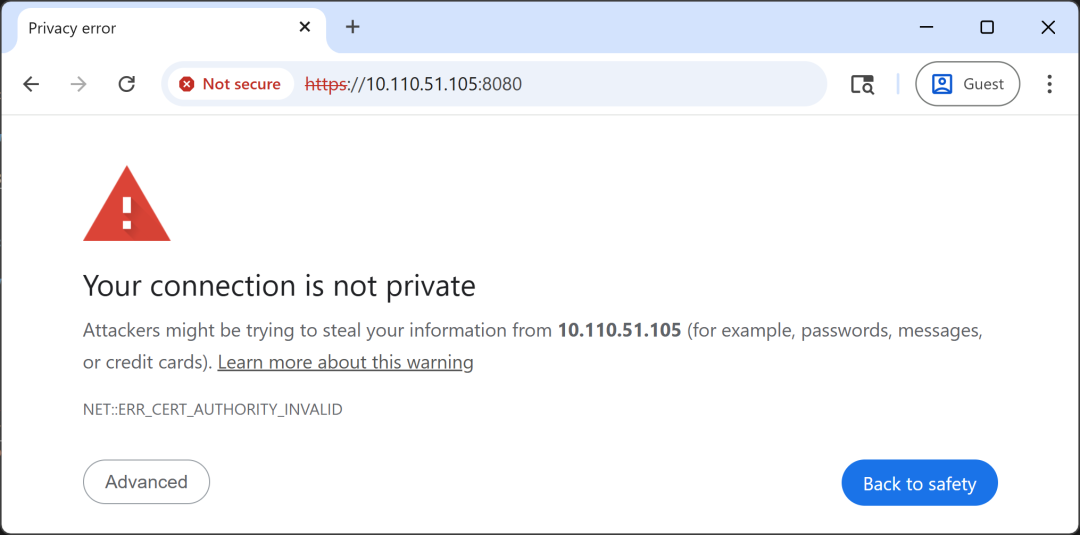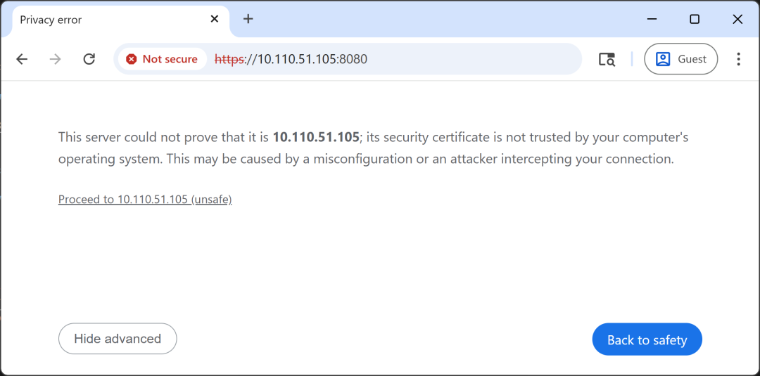 点击 “Advanced”(高级)→ “Proceed to <IP 地址 > (unsafe)”(继续访问)。