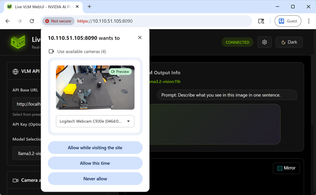 当浏览器请求摄像头权限时,选择 “Allow while visiting the site”(访问期间允许),确保 Jetson 外接摄像头正常采集视频流。