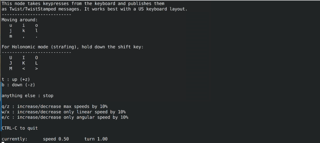 ros2 run teleop_twist_keyboard teleop_twist_keyboard 信息最后面会显示控制的方式: