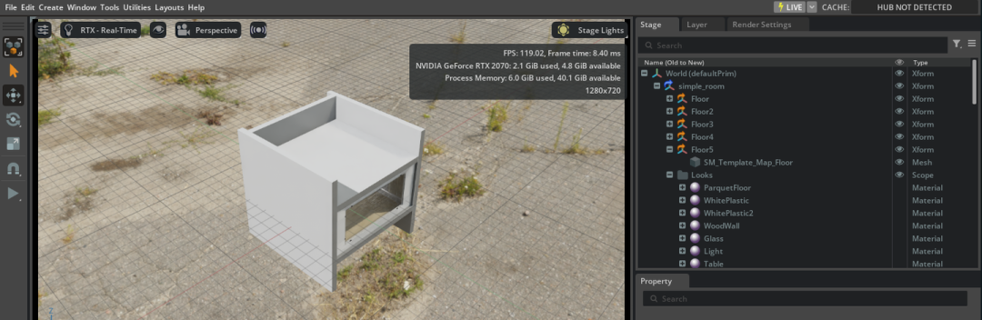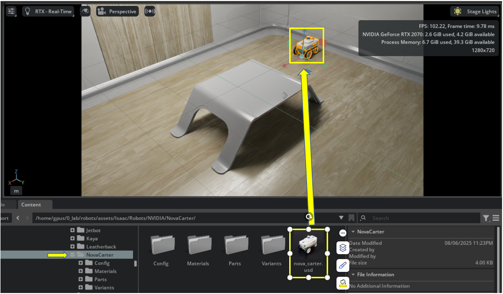 如果一切都正取的话,会看到 Nova_Carter 小车朝 X 轴方向在缓步前进(x=0.2)。你可以试试调整 'linear' 里面的参数,看看会产生什么变化,如果所有变量全部设为 0.0 的时候,小车就会停止,如下: