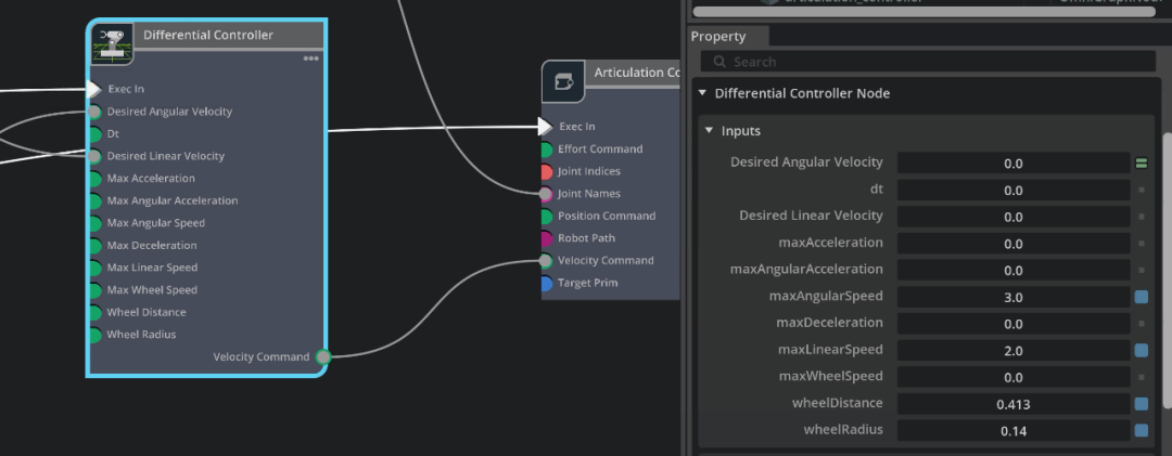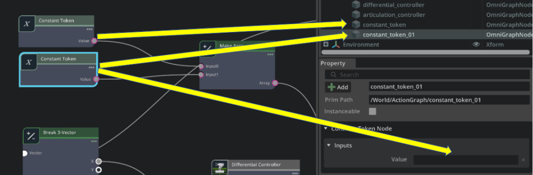 两个 Constant Token 节点对应到 Stage 下面 ActioGraph 的 constant_token 与 constant_token_01,点到每个节点在右下方都会出现 Property 视窗。不同节点的属性内容都不一样,我们在这里的 Inputs / Value 里面,分别为两个节点填入 joint_wheel_right 与 joint_wheel_left 。
