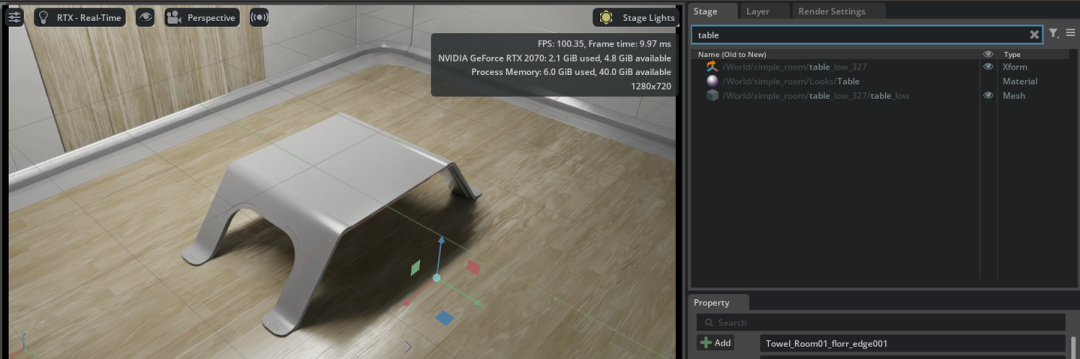 点击最右方属性为 Mesh 的 "table_low" ,然后在键盘上敲下 “F” 键,工作区就会看到如下图的状态:
