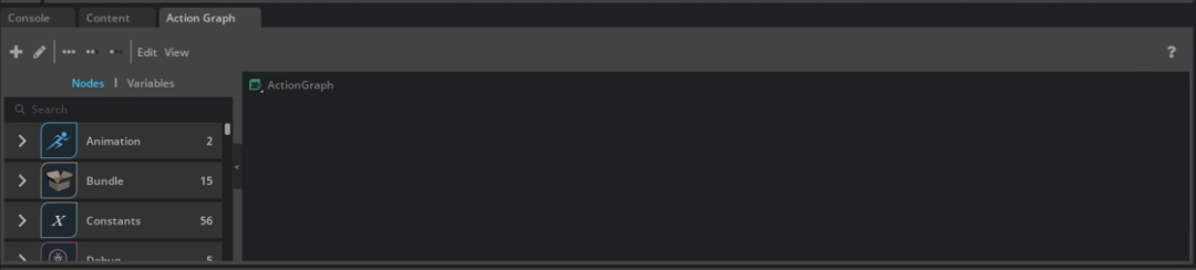 在上面过滤框中填入关键字,将下面种类节点拖拉到 Action Graph 编辑器中: