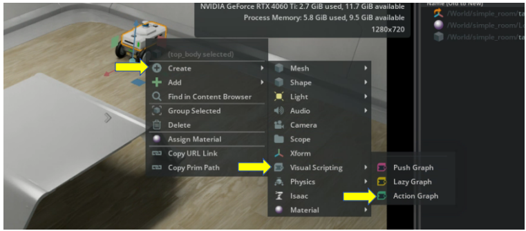 右键点击 Carter 车,然后按照 Create -> Virtual Scripting -> Action Graph 顺序(如下图)
