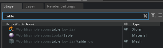 我们需要使用的是房间里面的小桌子,现在在右上角“Stage”的搜索框中填入“table”,就会过滤出三个项目: