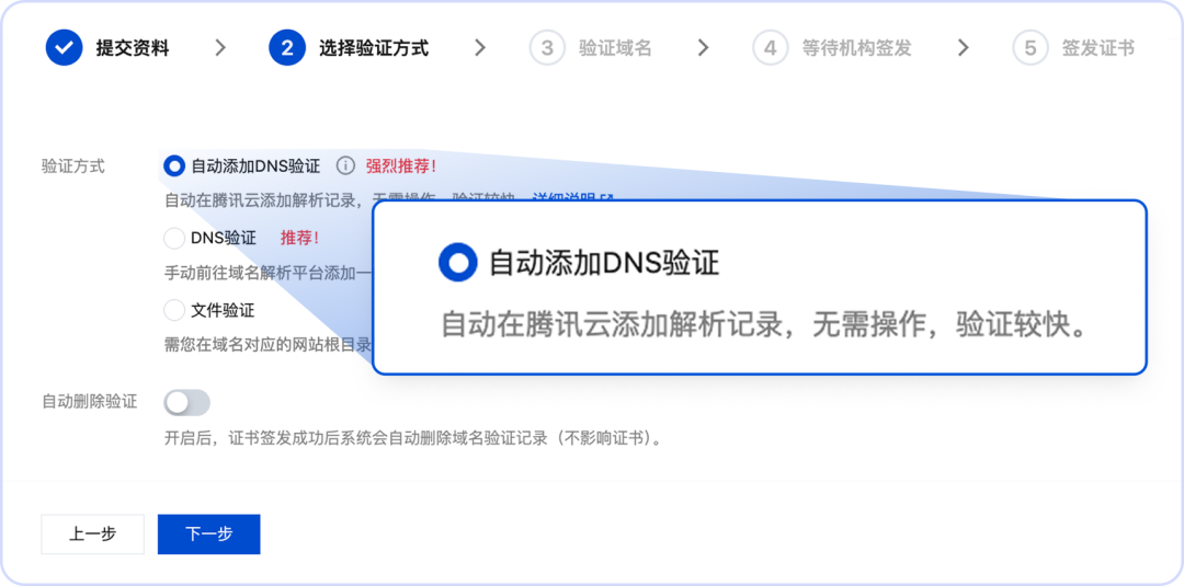 对于通用业务系统,可选用DV证书,将域名解析与证书服务一并托管至腾讯云,开启免费自动续期服务,节省成本与人力。
