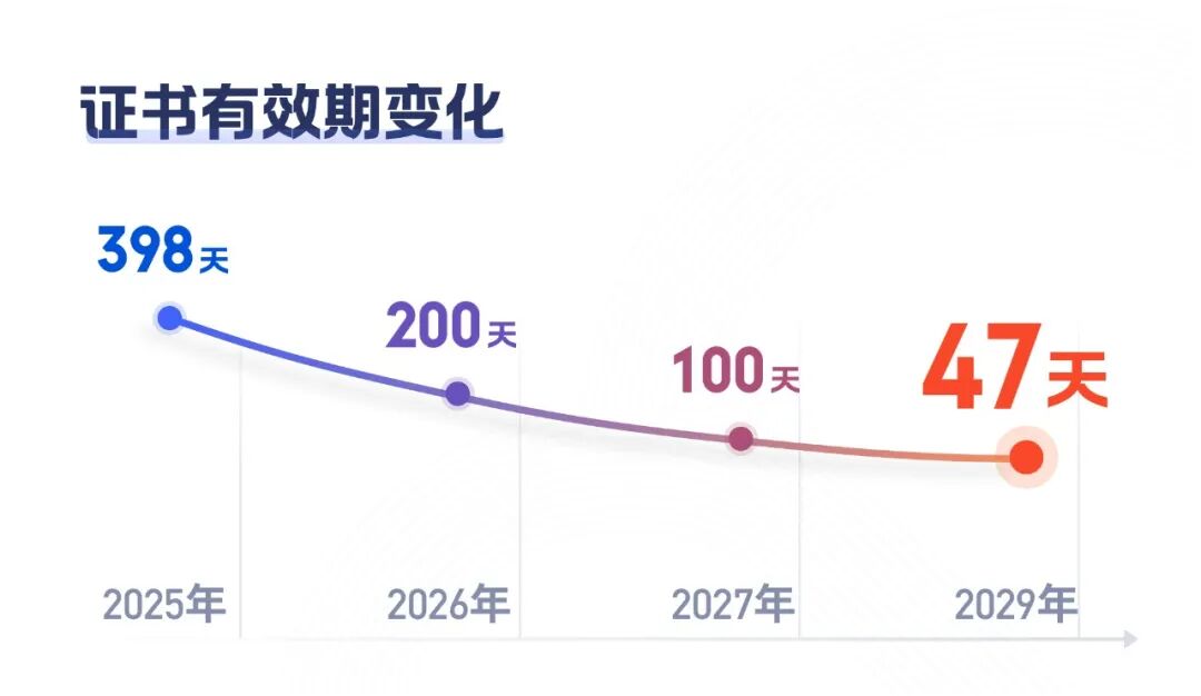 2025年4月,国际标准组织CA/浏览器论坛(由证书颁发机构(CA)和浏览器厂商组成的联盟)以压倒性票数通过SC-081提案,宣告SSL/TLS证书有效期将从398天逐步缩短至47天,2029年全面生效。 这一变革由苹果、谷歌、微软等科技巨头主导,标志着全球网络安全迈入“短周期、高频验证”时代。