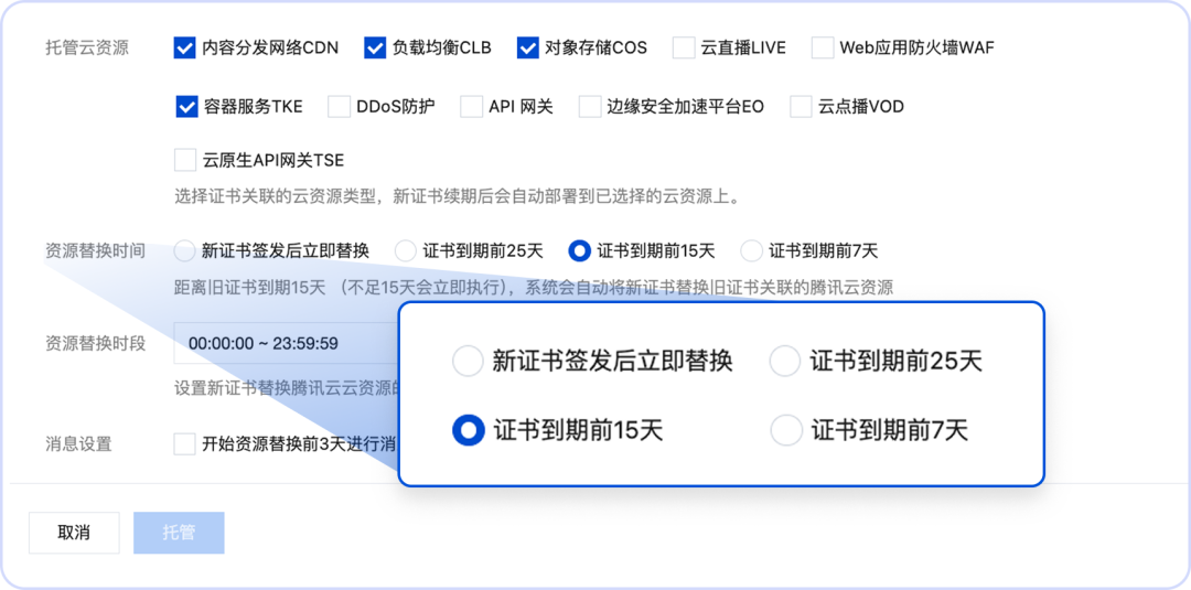 tips:不管你使用腾讯云的免费证书还是付费证书,都可以免费使用腾讯云的证书托管服务哦。