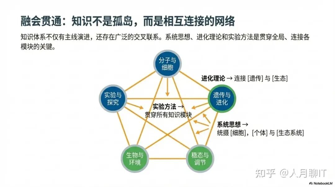 从关系维度看,知识模块之间存在着核心演进路径(从微观到宏观)和广泛交叉联系(遗传与生态的整合、实验与理论的互动),构成了立体的知识网络。