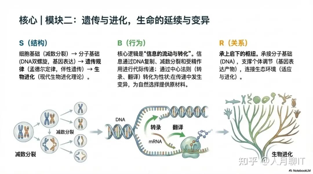 遗传与进化模块在知识结构上呈现出从现象到本质、从传递到变异的递进关系。