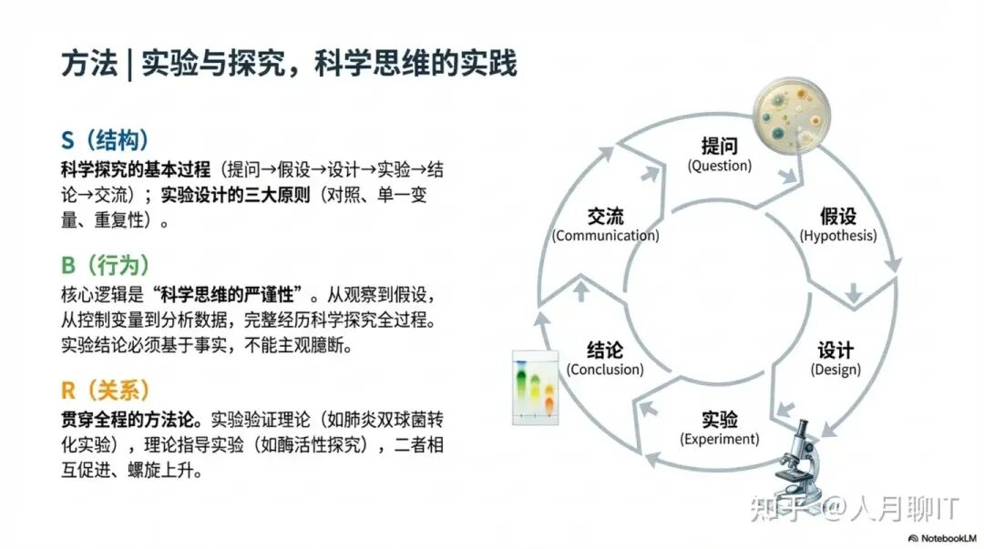 实验与探究模块是贯穿全程的方法论,与前四个模块形成”知识-方法”的辩证关系。实验验证了理论(如证明DNA是遗传物质的肺炎双球菌转化实验、证明DNA半保留复制的赫尔希和蔡斯实验),理论指导了实验(如根据酶的特性设计酶的活性受温度、pH影响的实验),二者相互促进、螺旋上升。
