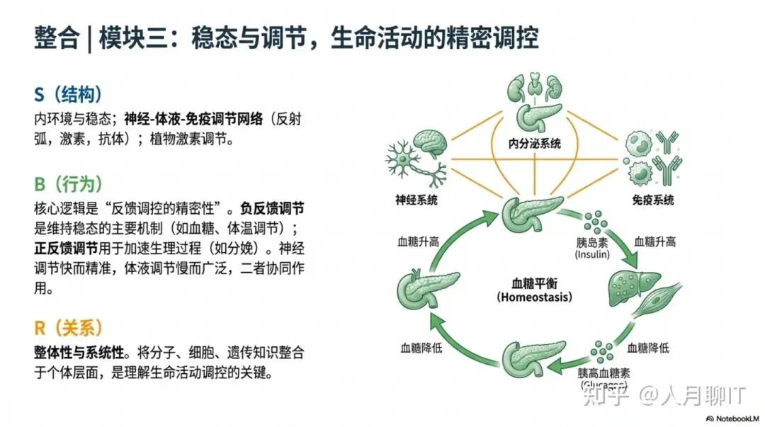 稳态与调节模块整合了神经调节、体液调节、免疫调节和植物激素调节四大系统,体现了生命活动的精确调控机制。