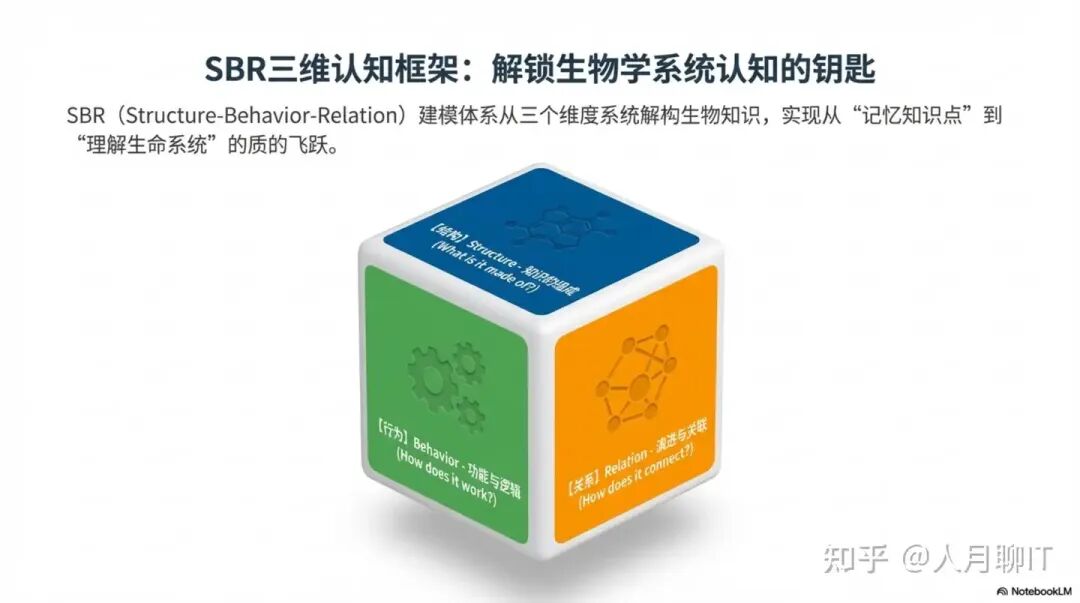 为了帮助学习者建立完整的生物学知识网络,本文引入SBR(Structure-Behavior-Relation)建模体系,从结构维度(知识组成)、行为维度(功能逻辑)和关系维度(演进脉络)三个层面,系统解构高中生物知识体系。这种三维理解框架不仅能够帮助学习者理清知识结构,更能揭示知识之间的内在联系,从而实现从”记忆知识点”到”理解生命系统”的质的飞跃。