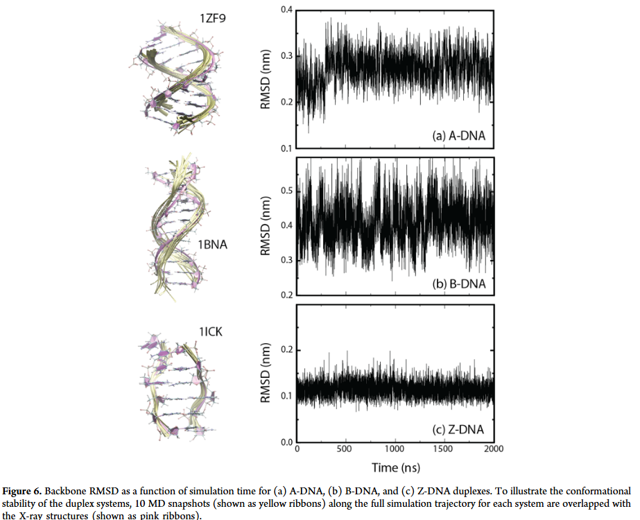 Creyon25准确保持A-DNA与Z-DNA的结构特征,但在B-DNA上的RMSD偏高,说明其χ角参数偏向A型构象。