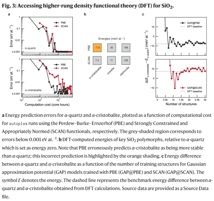 在SiO₂体系中,研究人员对比了不同DFT泛函下生成的训练数据,发现较高阶的SCAN泛函在晶型稳定性预测上明显优于PBE,从而凸显了在MLIP训练中采用更高层级参考数据的重要性。即便如此,利用autoplex生成的模型仍能在有限计算成本下实现较高预测精度。