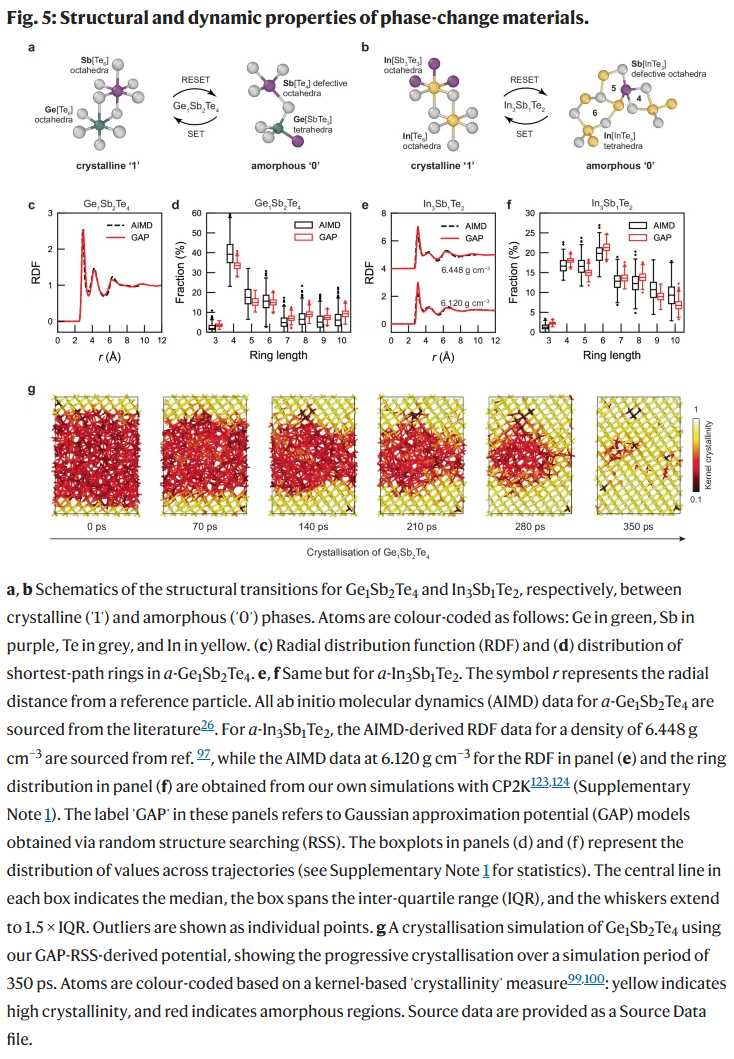 研究人员将autoplex应用于Ge₁Sb₂Te₄和In₃Sb₁Te₂两类相变存储材料。与过去依赖专家手工构建数据集的方式相比,autoplex能够快速、高效地探索复杂势能面并生成训练数据。模拟结果表明,autoplex在刻画局域结构特征、环统计学和结晶动力学方面均表现良好,并显著减少了人工操作与计算资源消耗。