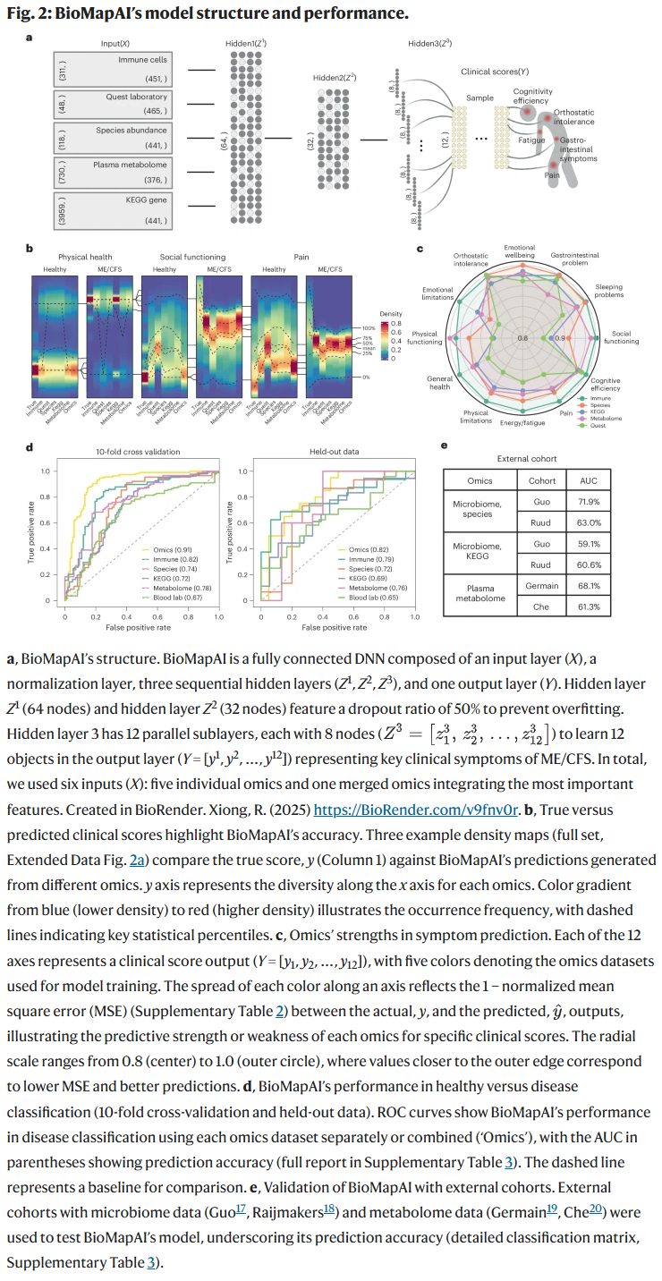 研究人员开发了一种人工智能驱动的多组学建模方法,能够同时整合转录组学、代谢组学、免疫学和临床数据,对疾病进行全面刻画。该方法不仅在不同队列中准确地区分 ME/CFS 患者和健康对照,还揭示了潜在的疾病分子特征与机制。进一步的分析表明,该框架有助于发现患者亚型,预测疾病严重程度,并为药物再利用和新疗法开发提供靶点。