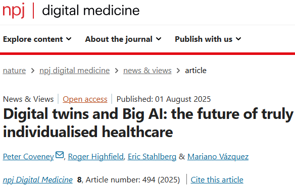 Coveney, P., Highfield, R., Stahlberg, E. et al. Digital twins and Big AI: the future of truly individualised healthcare. npj Digit. Med. 8, 494 (2025).