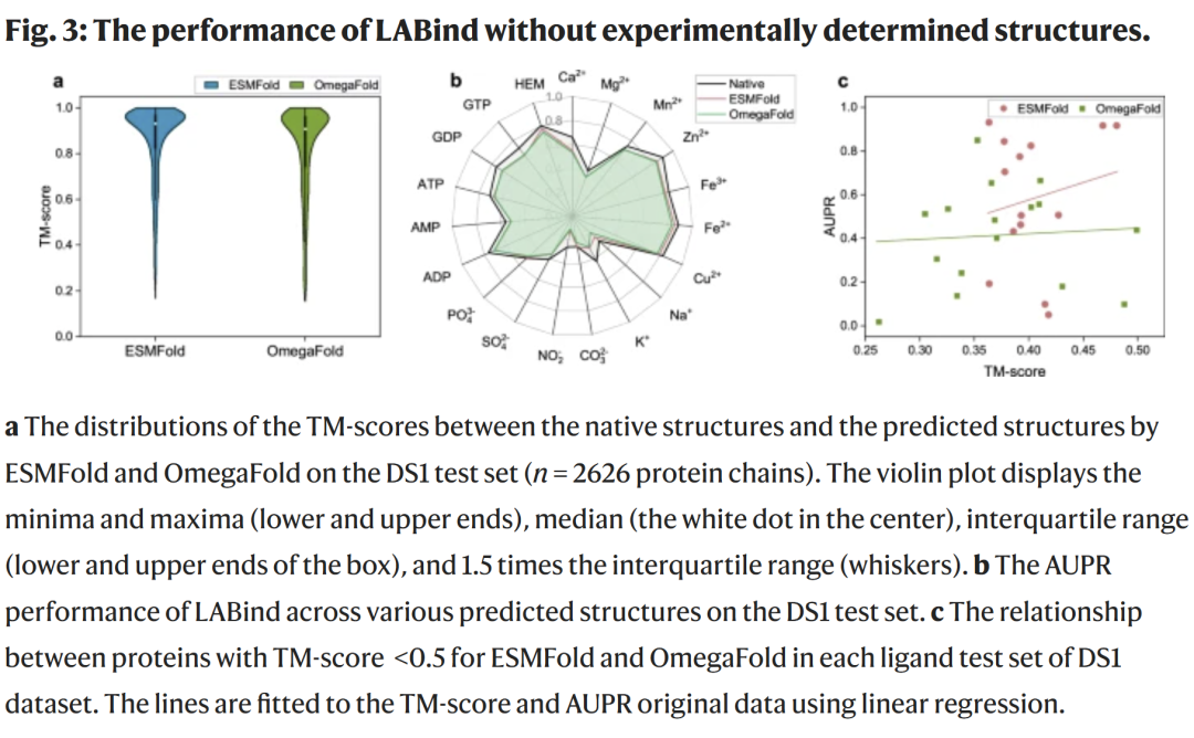 在无实验结构的情况下,研究人员结合 ESMFold 和 OmegaFold 的预测结构,测试 LABind 的稳健性。结果显示,即便使用预测结构,LABind 依然优于 LigBind,证明其对低质量结构的鲁棒性,并可扩展至基于序列的预测。