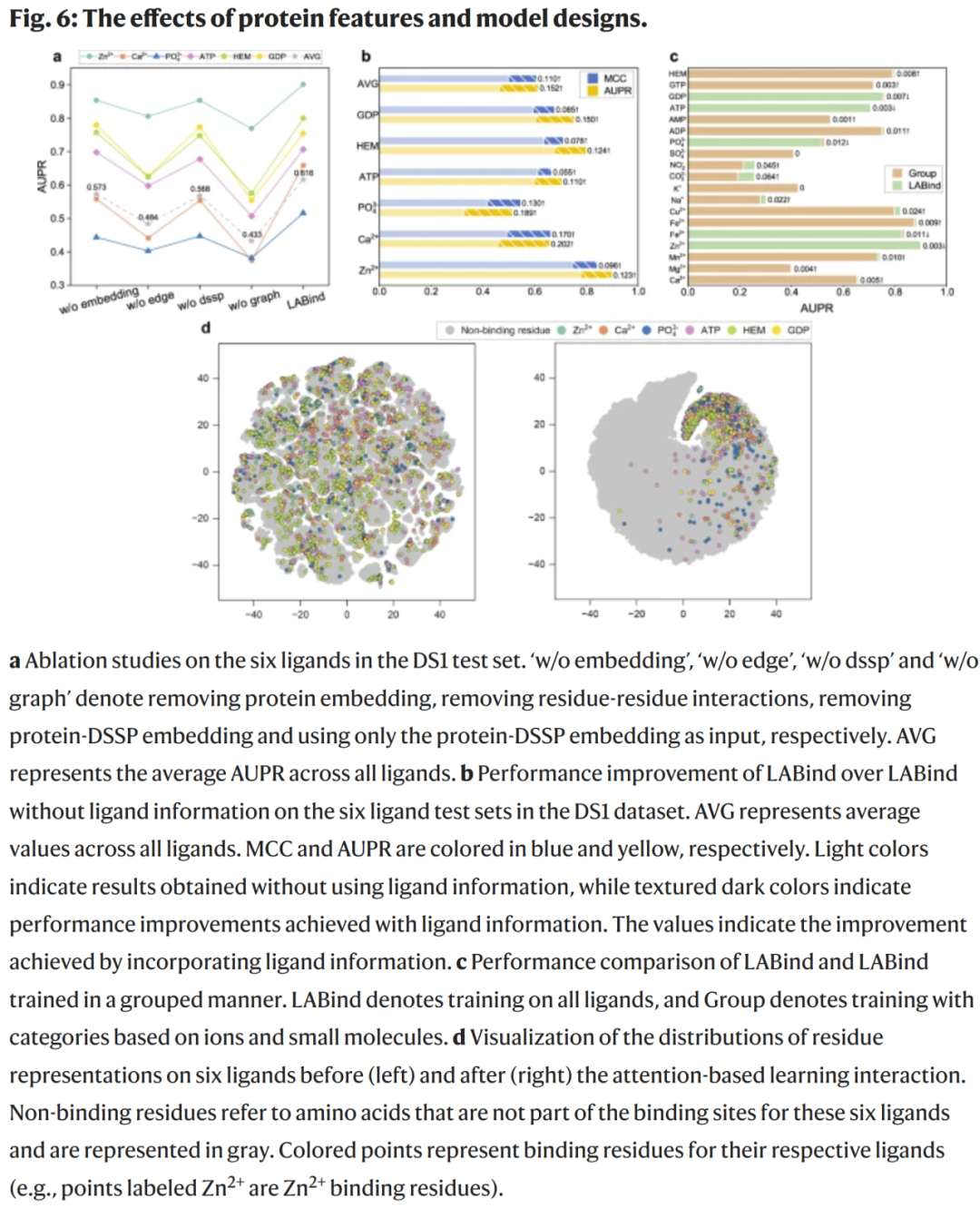 消融实验表明,蛋白图特征、序列嵌入和 DSSP 特征对模型性能均至关重要。去除配体信息后,模型性能明显下降,说明配体特征的引入对提升预测精度至关重要。可视化分析也显示,交叉注意力机制能有效区分结合残基与非结合残基。