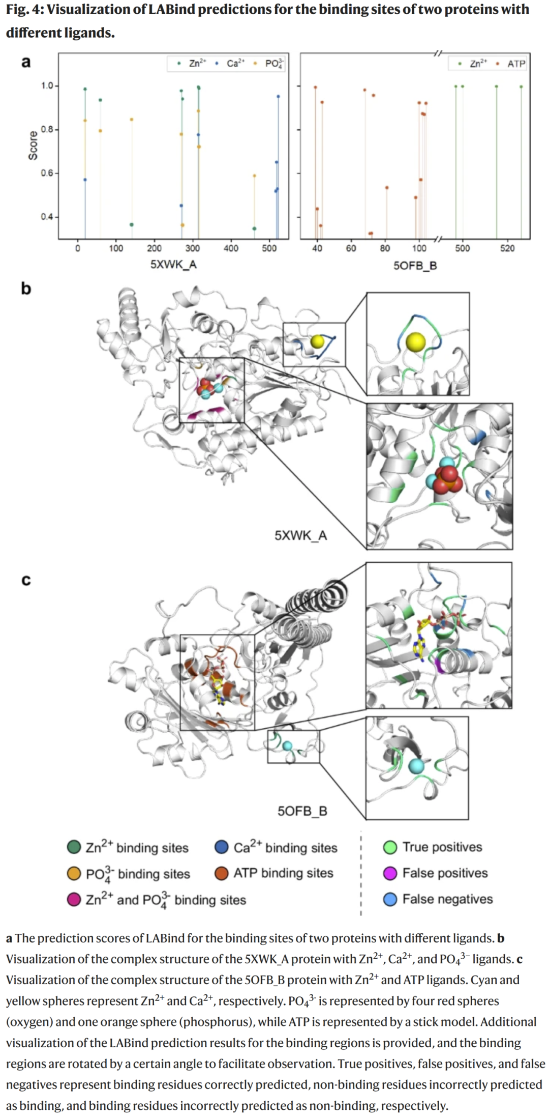 研究人员选择与多种配体结合的同一蛋白进行验证,结果表明 LABind 能清晰地区分不同配体的结合位点。例如,在同一蛋白上,Zn²⁺ 与 PO₄³⁻ 结合区域显著重叠,而 Ca²⁺ 的结合位点则明显不同,LABind 能准确捕捉这些差异。