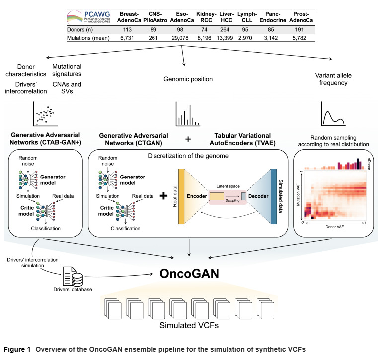 OncoGAN 是一个多模型集成流程,能够为八种不同癌症类型生成合成样本。该流程通过多种模型分别模拟突变类型、变异频率、基因组位置以及 CNA-SV 特征,并在最终整合为完整的基因组文件。结果显示生成的数据在突变密度、突变类型分布和供体异质性等方面与真实数据高度一致。