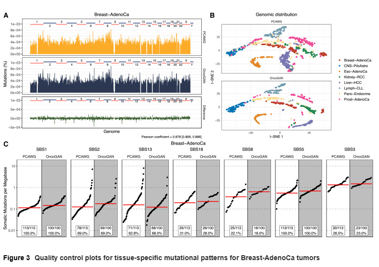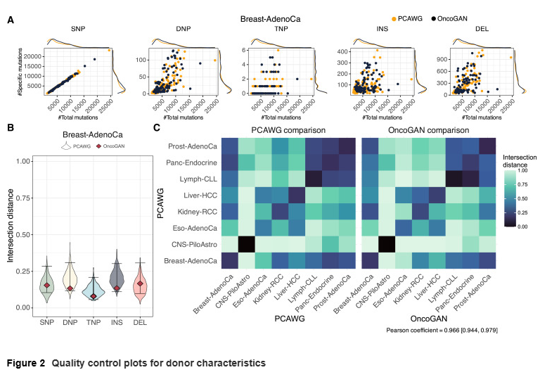 研究人员生成了数百个不同癌症类型的样本,并与真实数据比较。结果表明,OncoGAN 能准确再现供体间的突变负荷、变异等位基因频率分布及驱动基因间的相关性。模拟结果与真实癌症群体的差异极小。