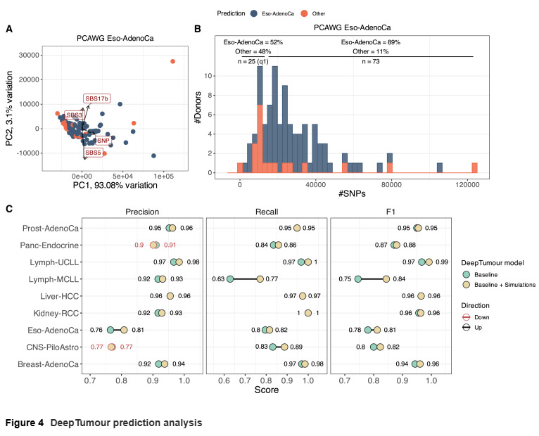 OncoGAN 在模拟中引入了肿瘤类型特异的驱动突变,且保持了其发生频率与相互关系。利用 ActiveDriverWGS 等工具验证表明,合成数据能够正确识别大部分驱动基因。DeepTumour 工具在合成数据上的预测准确率接近真实数据,并且当训练集中加入合成样本时,模型的整体准确性进一步提高,尤其在样本量较少的肿瘤类型中提升明显。