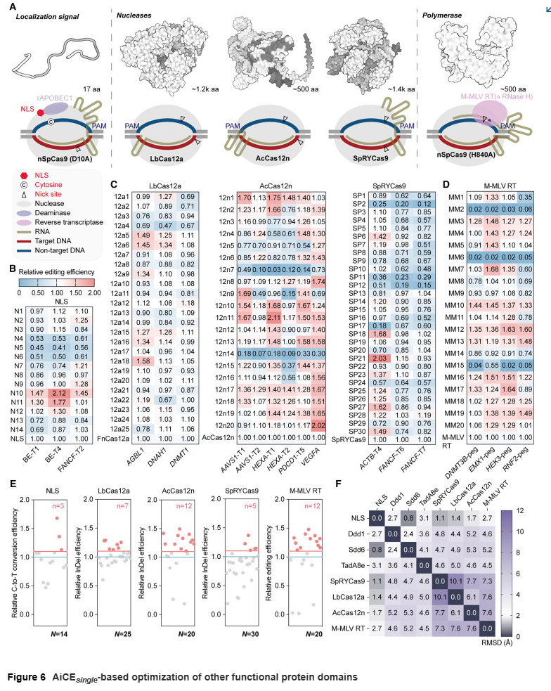 除了脱氨酶类应用,研究人员还将 AiCEsingle 模块扩展到核酸酶、逆转录酶和核定位序列等任务中。无论是小型结构域还是上千残基的复杂酶类,AiCEsingle 都能高效推荐高适应性突变,说明该框架具有广泛适用性和可扩展性。