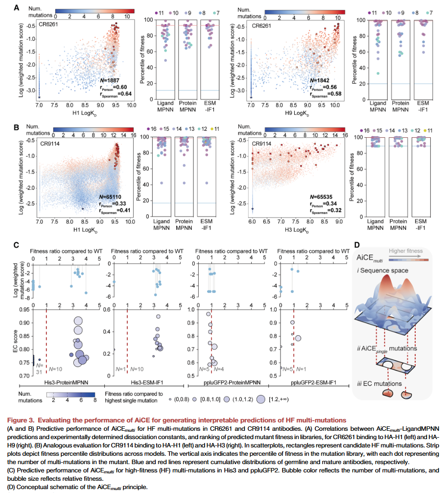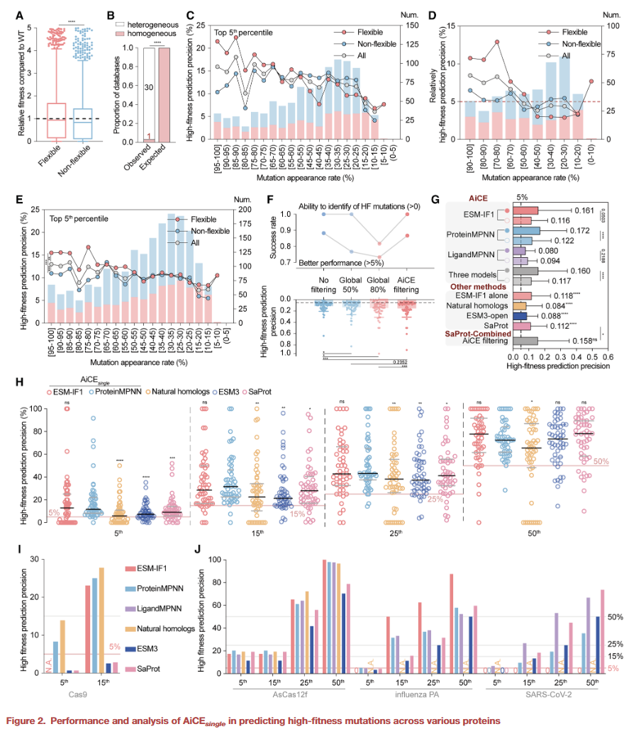 研究人员首先利用逆折叠模型结合结构约束,预测蛋白中的高适应性(high-fitness, HF)突变。通过在不同蛋白工程任务中测试,结果显示该方法能有效区分功能增强突变与中性或有害突变。与传统依赖经验或单纯深度学习的模型相比,AiCE 在命中率和效率上表现更佳。