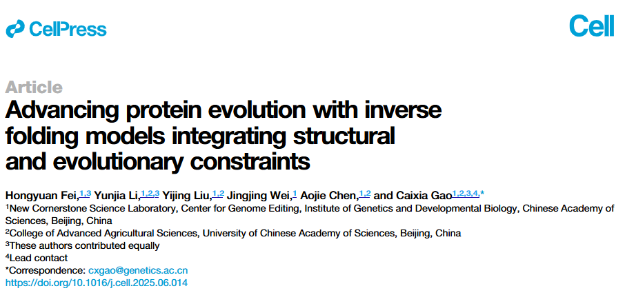 Fei H, Li Y, Liu Y, Wei J, Chen A, Gao C. Advancing protein evolution with inverse folding models integrating structural and evolutionary constraints. Cell. 2025 Aug 21;188(17):4674-4692.e19. doi: 10.1016/j.cell.2025.06.014. Epub 2025 Jul 7. PMID: 40628259.