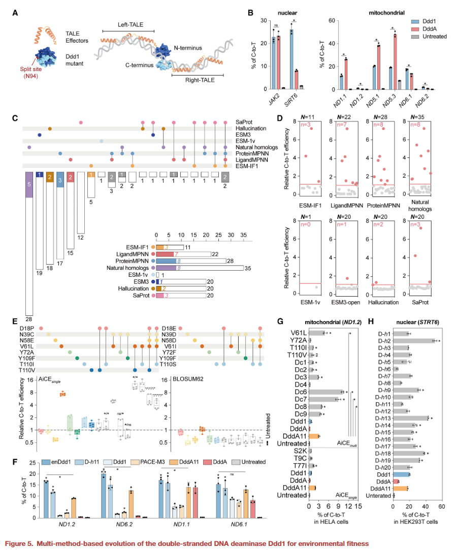 双链 DNA 脱氨酶在复杂细胞环境中的稳定性和活性往往受限。研究人员利用 AiCE 策略引入多点突变,获得了适应性更强的变体 enDdd1-DdCBE。该工具在细胞中表现出高达 14.3 倍 的线粒体编辑活性提升,展示了显著的进化改造潜力。