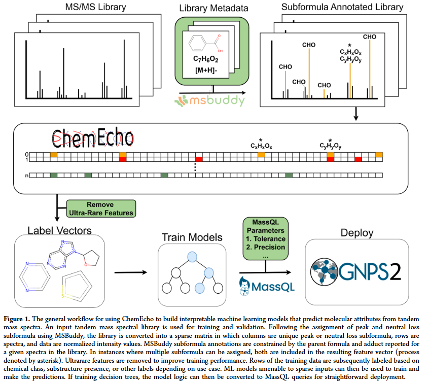 串联质谱是代谢组学中常用的分析方法,但传统的光谱库比对方法只能注释少量特征。近年来,机器学习工具被开发用于直接从光谱预测分子属性,例如化学类别或分子结构。然而,这些方法往往牺牲了可解释性,产生“黑箱”式预测。缺乏可读的规则限制了研究人员直接利用这些模型来提出假设或设计查询。为了解决这一问题,研究人员提出了 ChemEcho 方法,能够将碎片化数据表示为稀疏且可解释的特征向量,为训练可解释的模型(如决策树)提供基础,并可无缝转化为 MassQL 查询。