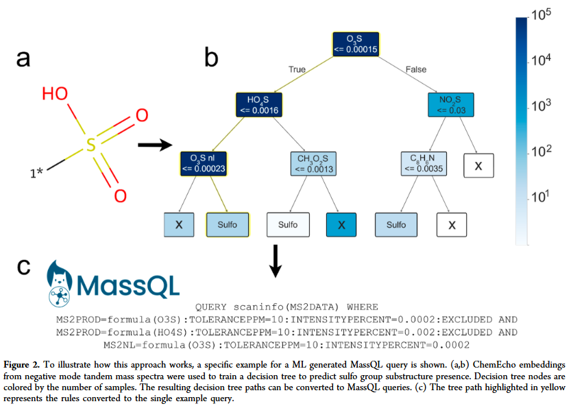 研究人员将决策树逻辑直接转化为 MassQL 查询,使规则更直观、易共享。例如,通过训练 sulfo 基团的分类器,模型识别了典型的 HO4S 和 O3S 碎片及中性损失路径,并将其转化为 MassQL 查询。这样,研究人员能够快速从数据中检索到具有特定结构特征的光谱。
