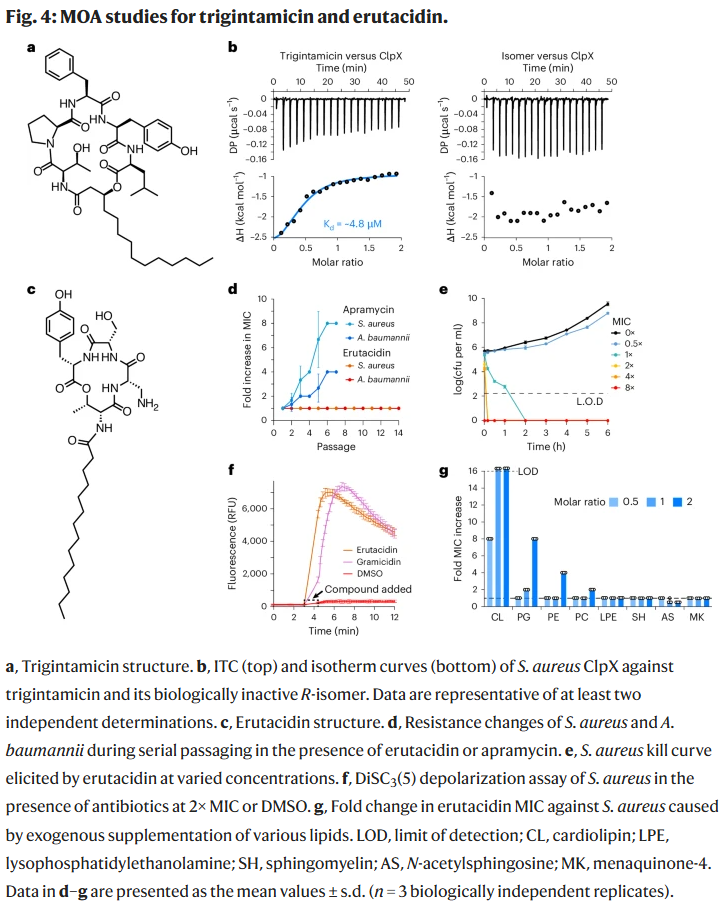 Erutacidin 被证实通过结合心磷脂导致细菌膜去极化,这是临床抗生素中少见的机制,因而对耐药菌株依旧保持高效。Trigintamicin 则直接结合细菌 ClpX 蛋白,影响其蛋白降解过程。研究人员通过突变体分析与热量滴定实验验证了其特异作用机制。这些结果表明,长读长宏基因组结合合成策略能够挖掘出具有独特作用靶点的抗生素。