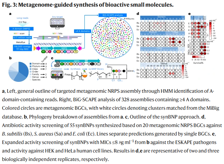 研究人员通过隐马尔可夫模型搜索,筛选出含有 NRPS 基因片段的读段,并定向装配出 338 条大规模基因簇。随后,利用 synBNP 方法(生物信息学预测 + 全合成),从 20 个不同来源的 NRPS 基因簇预测并合成了 55 个候选肽。活性筛选发现其中 5 个分子具有显著抗菌活性,最终重点鉴定了两种新型抗生素: