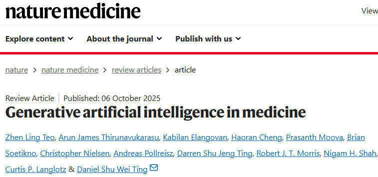 Teo, Z.L., Thirunavukarasu, A.J., Elangovan, K. et al. Generative artificial intelligence in medicine. Nat Med (2025).