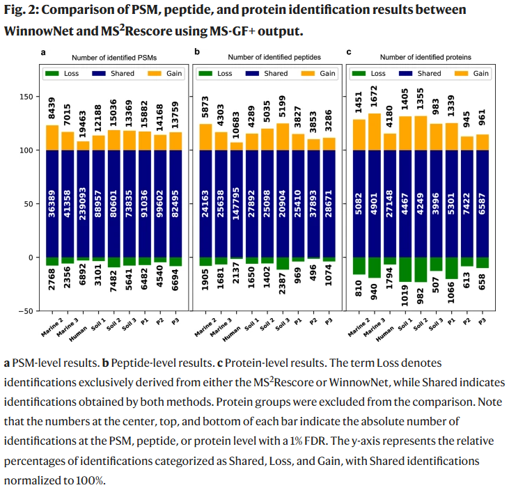 总体而言,WinnowNet 显著提升了宏蛋白质组数据的肽段与蛋白识别率,为复杂微生物群落功能解析及个性化医学研究提供了新工具。