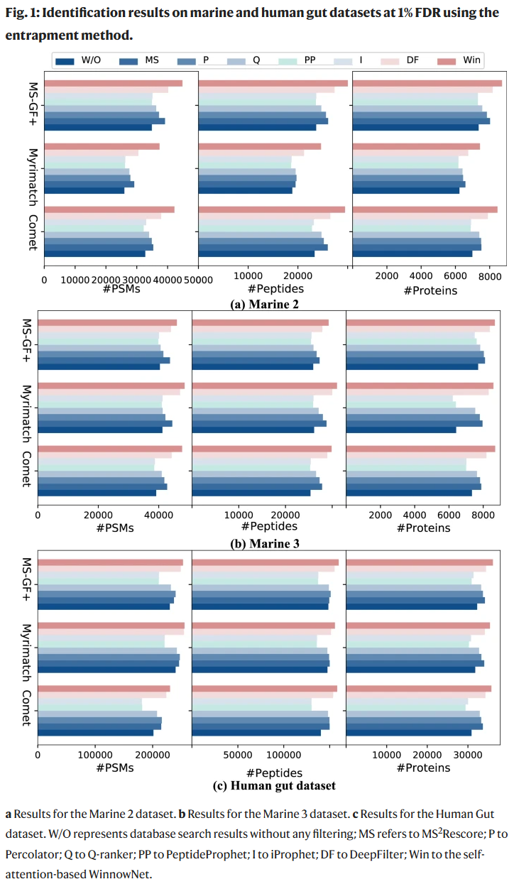 研究人员将 WinnowNet 集成至四种常用宏蛋白质组分析平台:Sipros-Ensemble、FragPipe、Peaks Studio 和 AlphaPept。